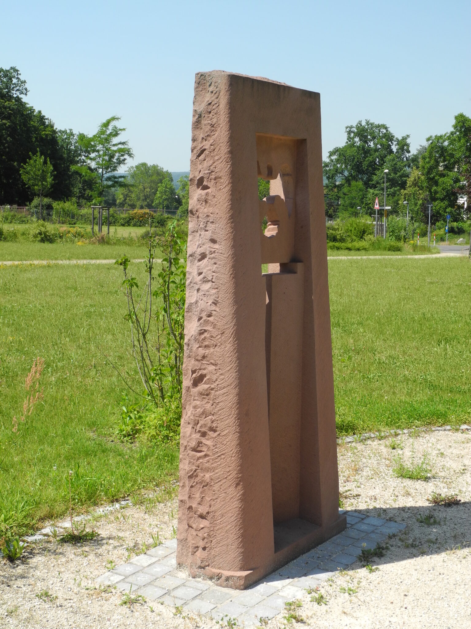 Die Sandsteinstele bildet eine Kartusche für einen kreuzförmigen Sichtschlitz mit der darüber