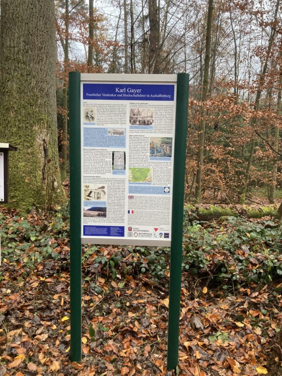 Die neue Informationstafel stellt die historischen Zusammenhänge anschaulich dar und würdigt Gayers Einfluss auf die nachhaltige Forstwirtschaft sowie die Geschichte der Aschaffenburger Forstlehranstalt.